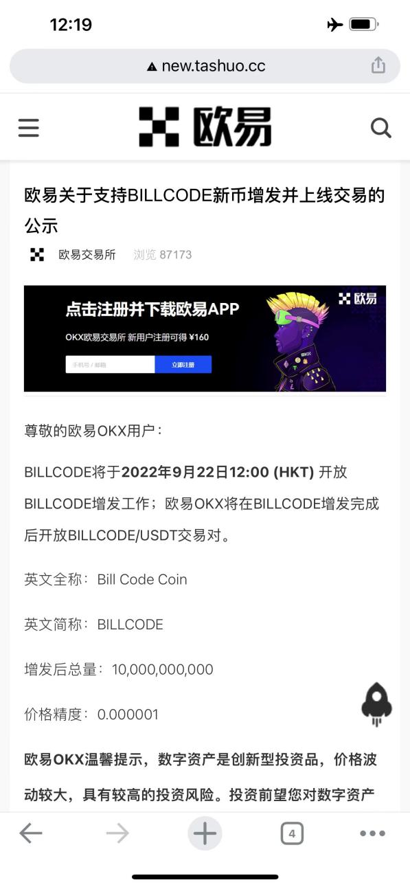 欧易OKx关于支持BILLCODE新币增发并上线交易的公示于2022年9月22日12:00(HKT)正式在欧易交易所快报公示告知: