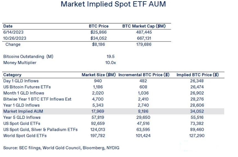假设自 ETF 文件提交以来,所有价格上涨都归因于 ETF 推出的预期(我们承认这个假设过于简单化),那么比特币市值在那段时间的变化为 180B 美元,意味着现货 ETF 的 AUM 接近 18B 美元(基于 10 倍货币乘数)。如果考虑到资金流动的时间,这个分析就会变得越来越复杂,但这个分析仍然具有启发性,可以在不过于规范的情况下增加价值。