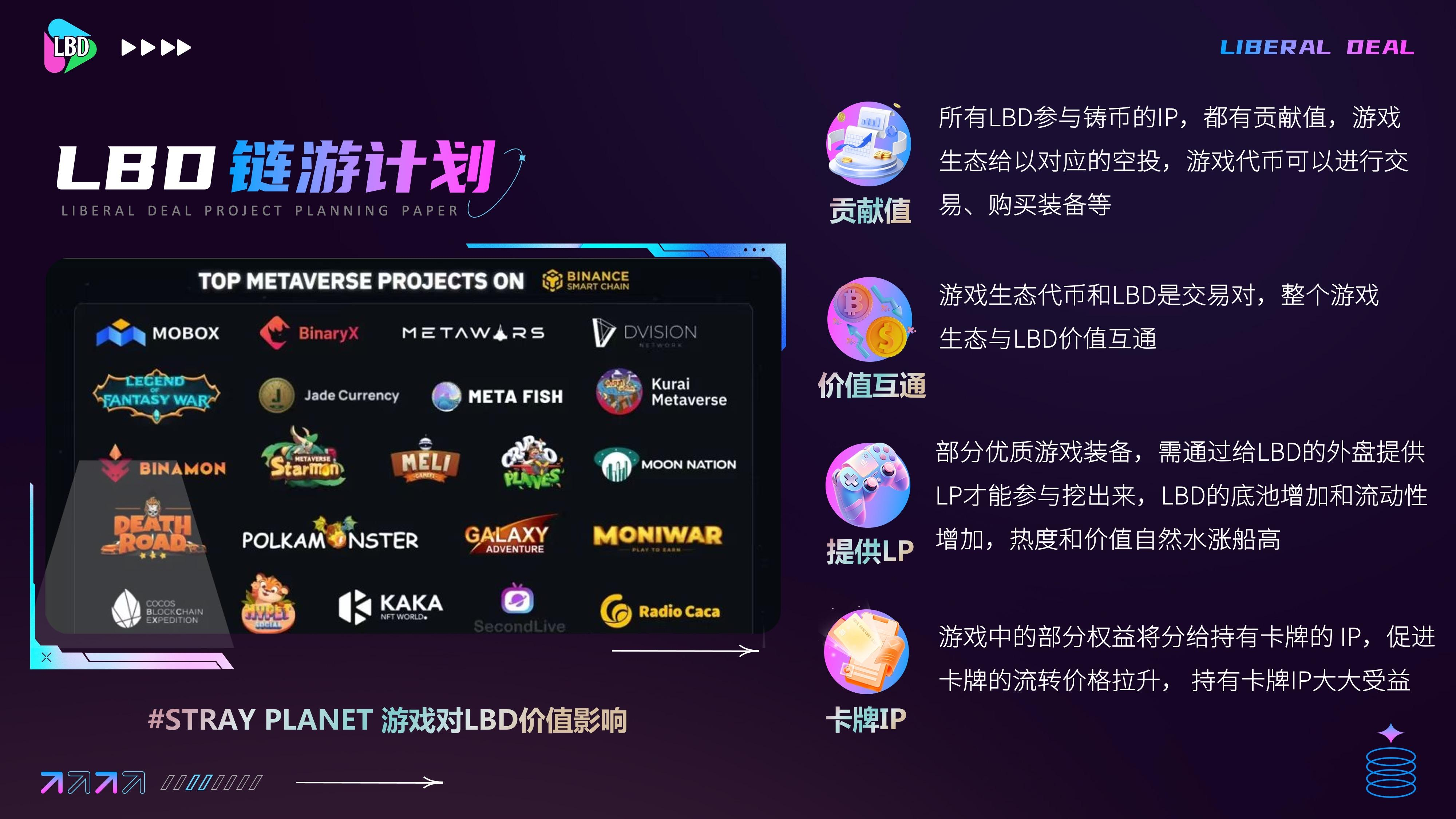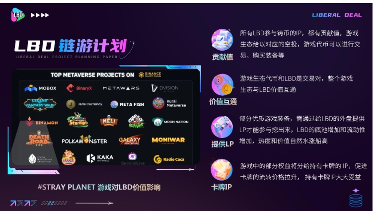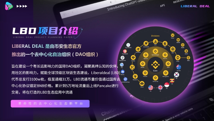 旨在建设一个有长远影响力的国际DAO组织,凝聚高纬认知的伙伴,用社区的影响力,赋能全球顶级区块链生态建设。Liberal deal (LBD) 代币总发行3100w枚,极至通缩31万,LBD流通币量价值通过国库去中心化协议锚定BNB价格。累计到5万地址流量后上线Pancake进行交易, Liberal deal生态体系是由LBD Token, NFT理财,链上购物,Gamefi,Socialfi ,AI理财等组成。生态流通消耗的是LBD。