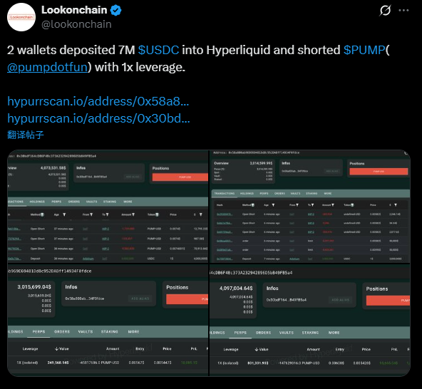 这笔大额仓位在链上被追踪后,引发了大量社区讨论,做空压力也随之上升,CoinMarketCap数据显示,PUMP 价格24小时内下跌了 9.32%。