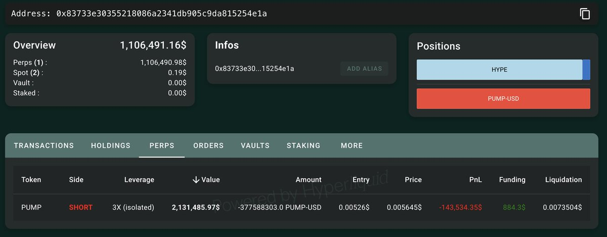 2025年7月12日,根据 LookIntoChain 链上追踪数据显示,一位开头为 0x8373 的巨鲸地址在 HyperLiquid 上开设了价值 213 万美元的 PUMP 代币空头仓位,使用 3 倍杠杆。