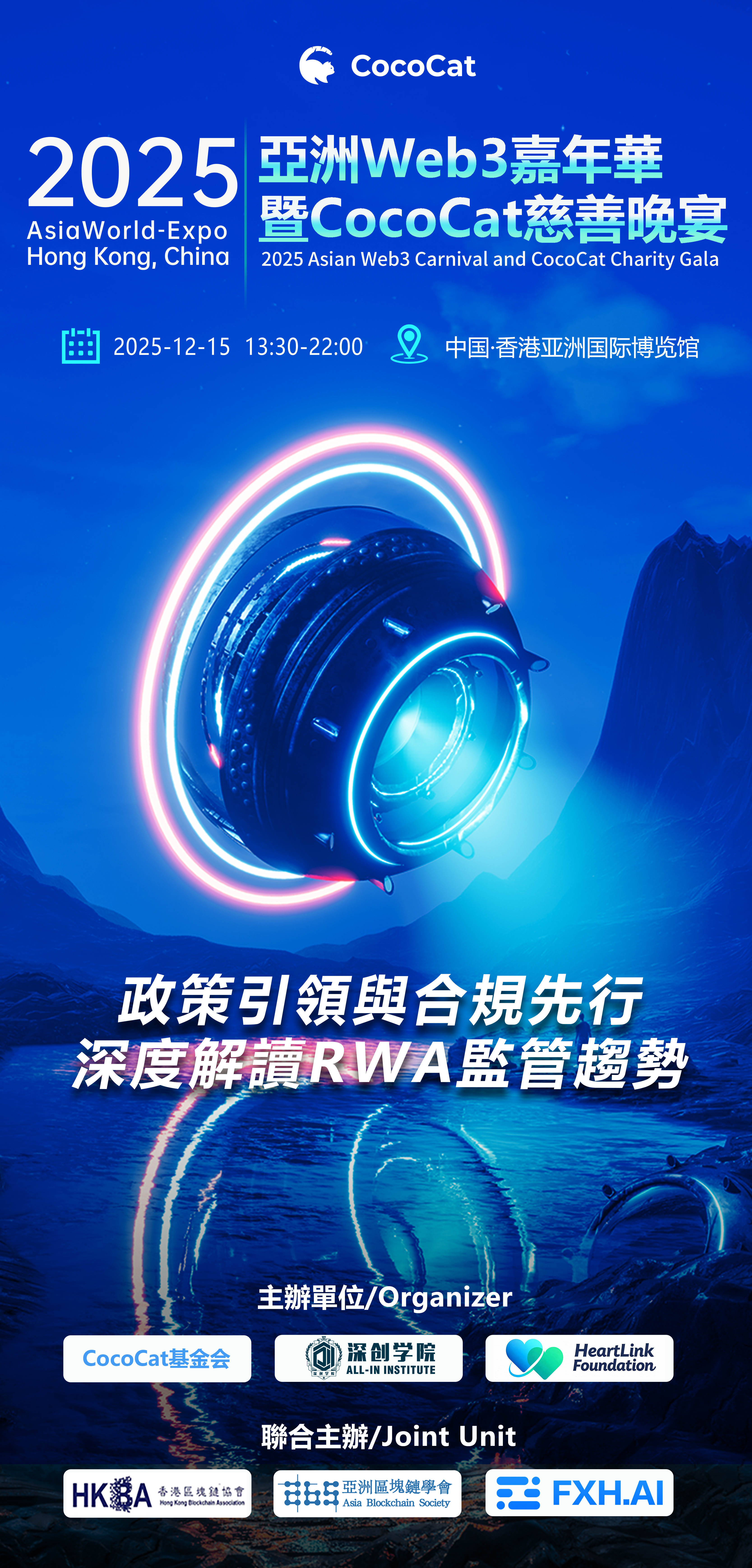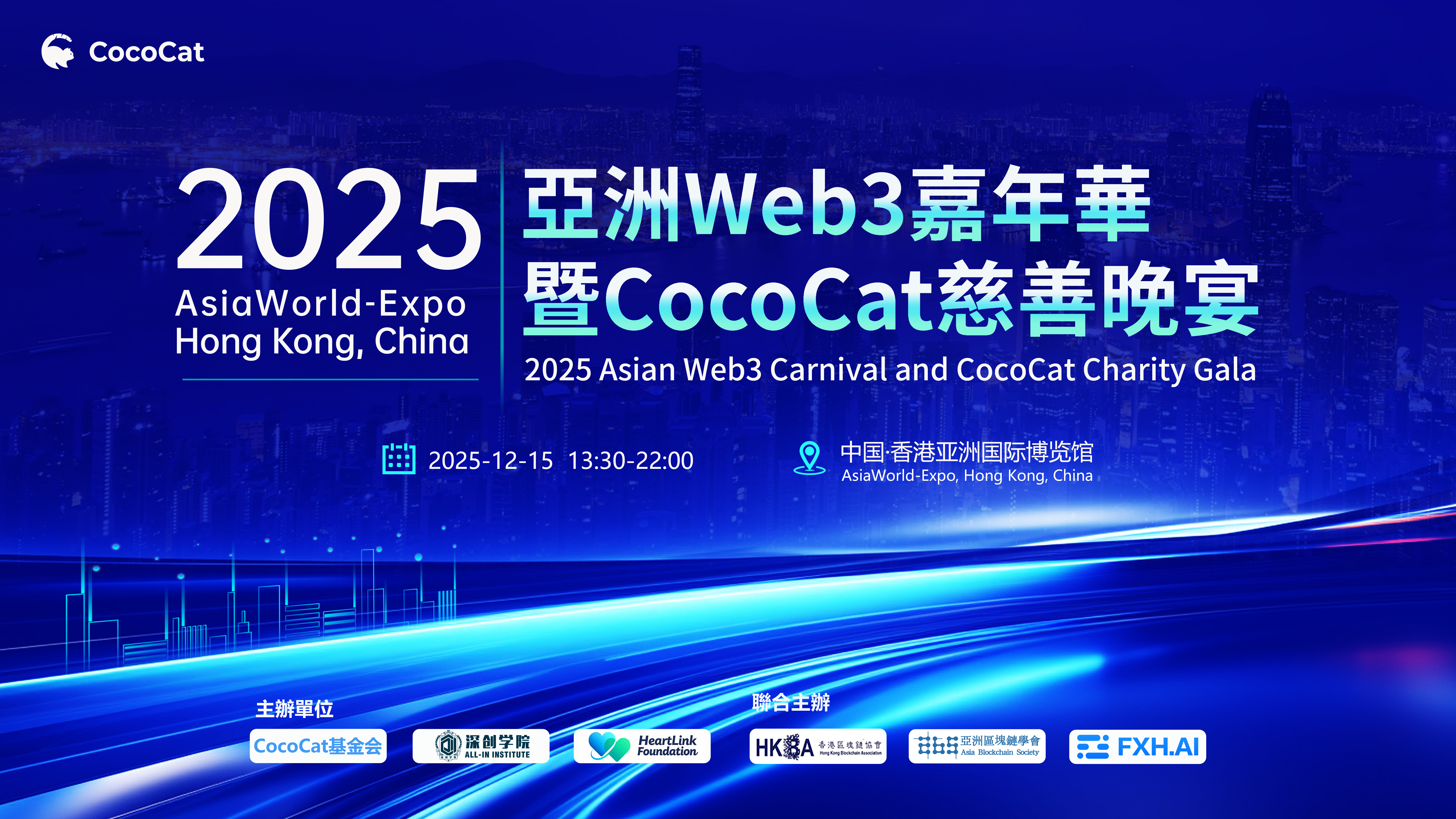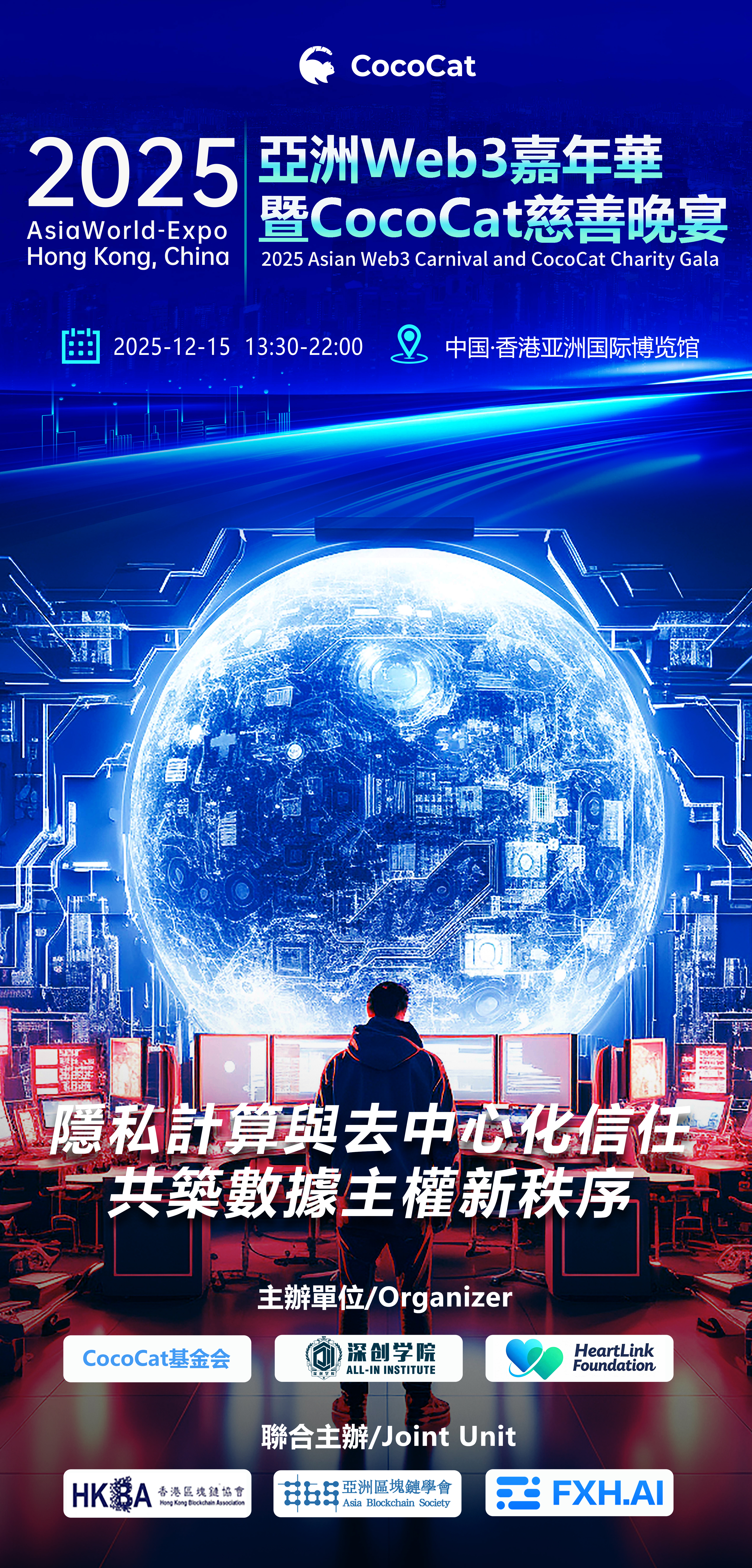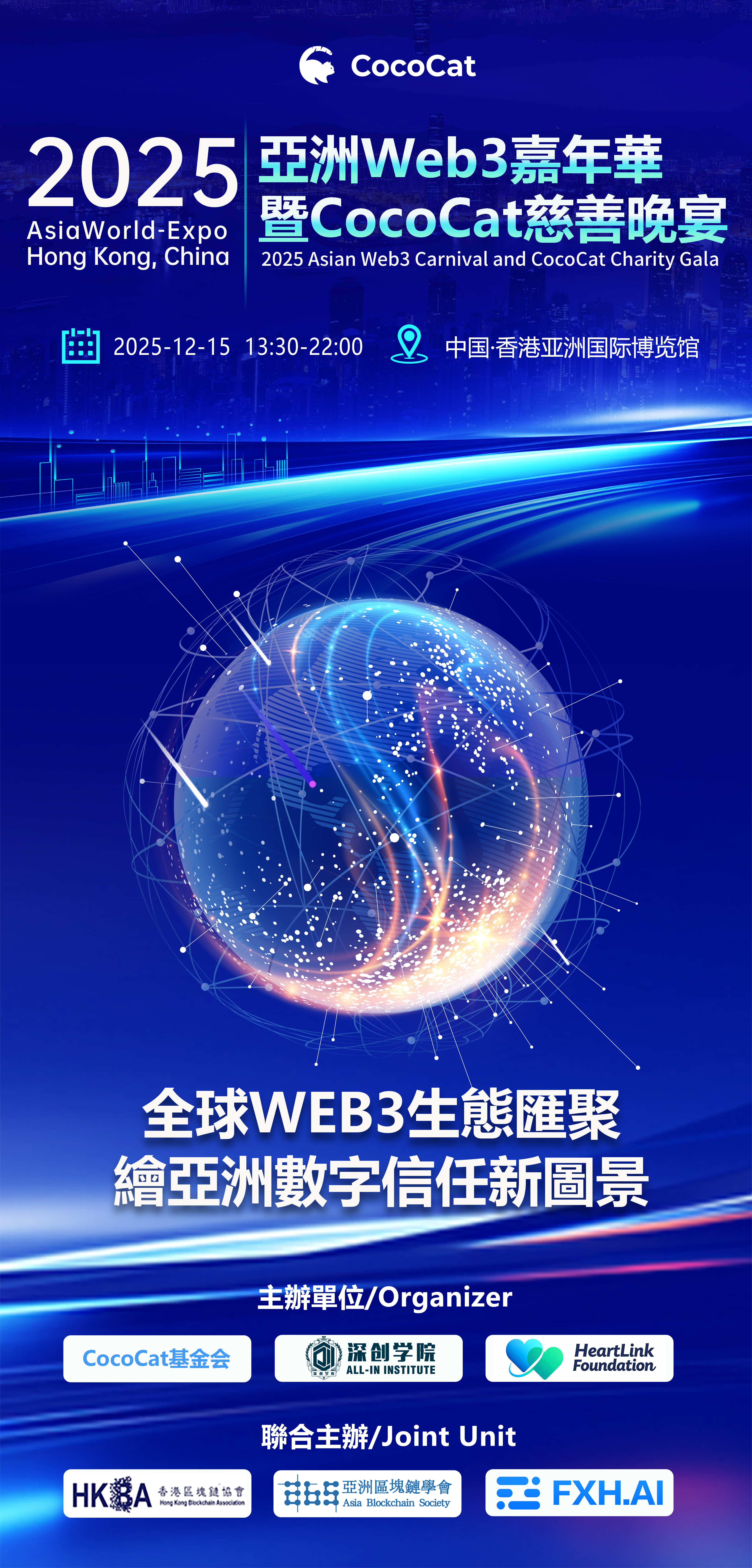 由CocoCat基金会与深创学院联合主办的“2025亚洲Web3嘉年华暨CocoCat慈善晚宴”将于2025年12月15日在中国香港亚洲国际博览馆隆重启幕。本次盛会以“隐私重构信任,价值驱动公益”为核心主题,旨在汇聚全球Web3领域的建设者、思想领袖与公益践行者,共同探索数字信任、数据主权与科技向善的未来发展路径,推动构建可信、包容的数字经济新生态。